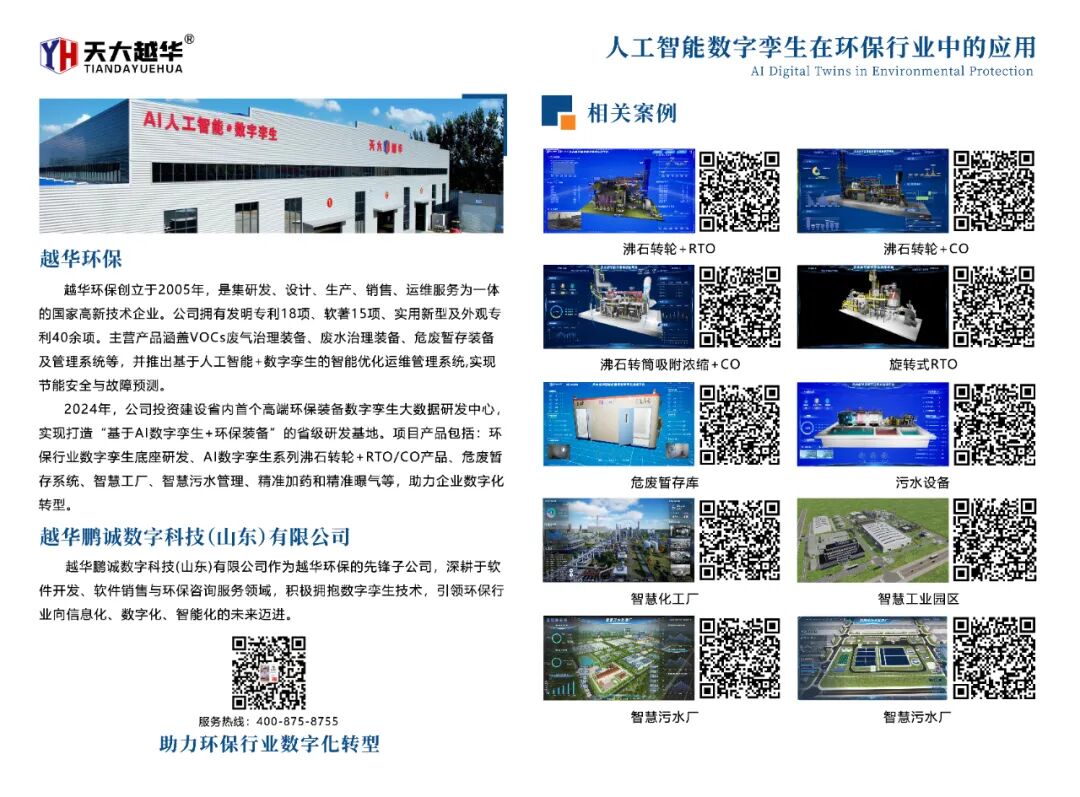 越华环保创立于2005年,是集研发、设计、生产、销售、运维服务为一体的国家高新技术企业。公司拥有发明专利18项、软著15项、实用新型及外观专利40余项。主营产品涵盖VOCs废气治理装备、废水治理装备、危废暂存装备及管理系统等,并推出基于人工智能+数字孪生的智能优化运维管理系统,实现节能安全与故障预测。